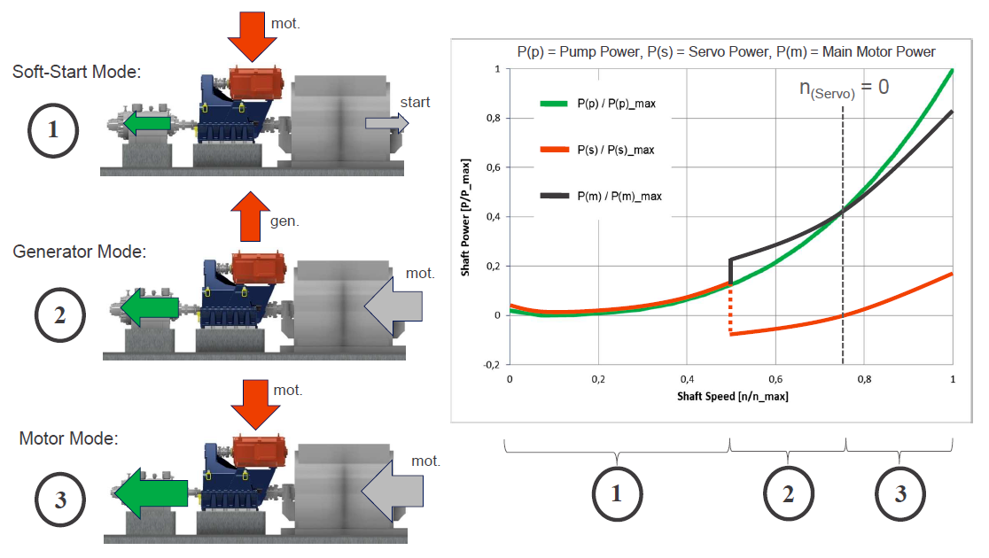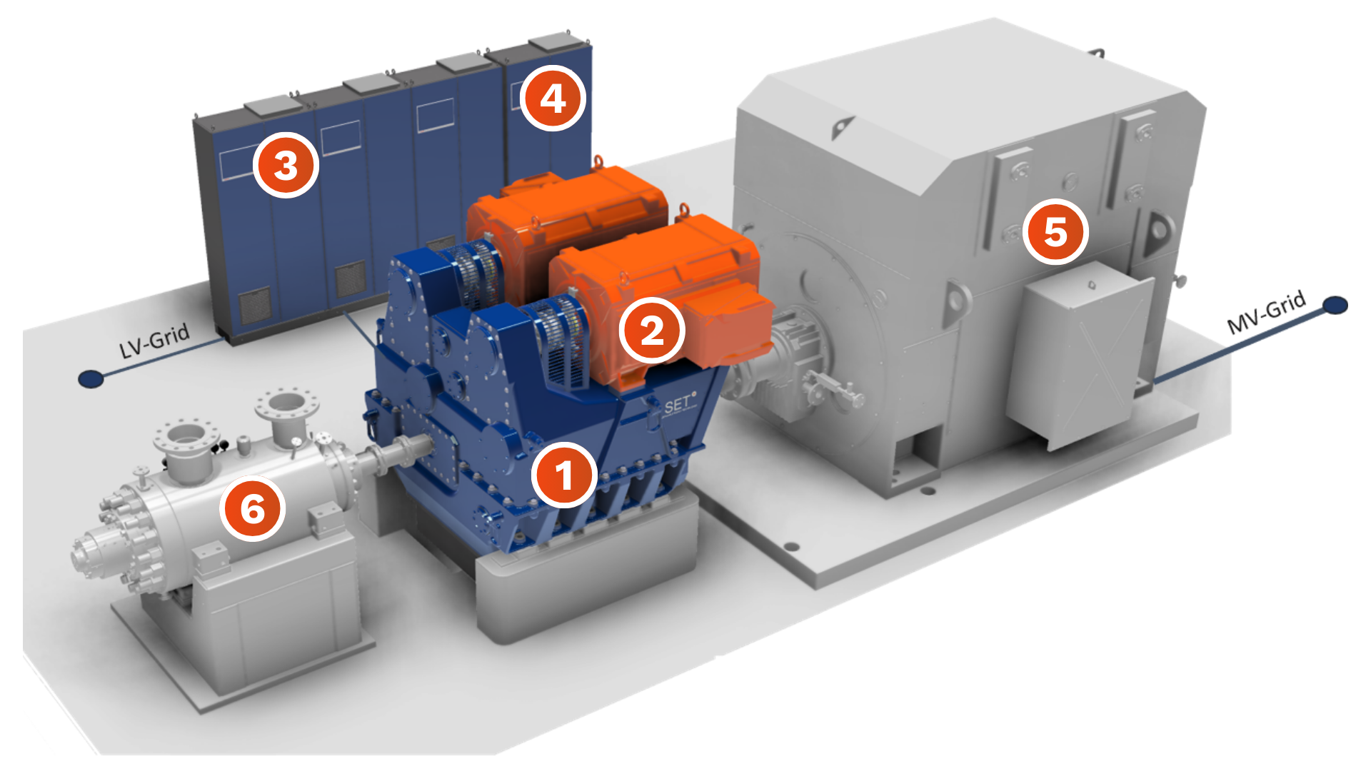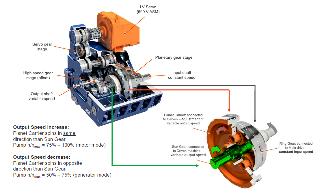 The SETCON® System consists of a Gearbox incl. differential gear (planetary gear) (1), Servos in combination with a low-voltage Frequency Converter (2+3) and a Control Cabinet (4). The constant power supply is done by an electric motor as the medium-voltage Main Motor (5). The variable output is transmitted to a Driven Machine (6) e.g. a Pump or Compressor. The medium-voltage Main Motor (5) is connected directly to the MV-grid and drives the planetary gear’s ring gear at constant speed. The differential gear’s sun wheel transmits the variable speed through an optional high-speed gear unit (offset alignment) to the Driven Machine (6). The differential gear’s planet carrier is connected to the Servos. The speed of the Servos (2) is controlled firstly in order to ensure the speed at the Driven Machine (6) is variable when the speed of the Main Motor (5) is constant, and secondly to control the torque in the entire drive train.