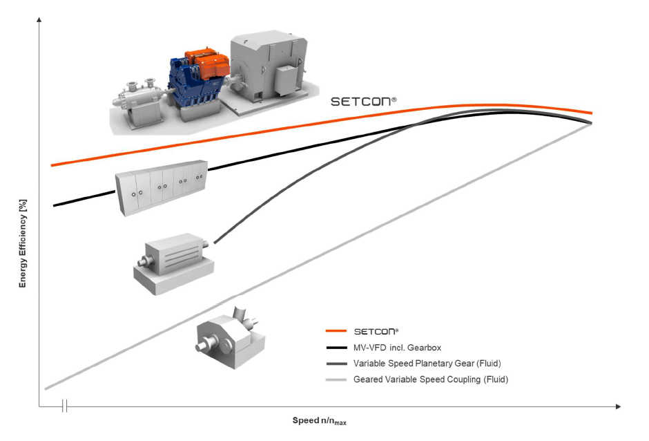 SETCON technology achieves outstanding efficiency — far above conventional variable-speed systems. The result: lower power consumption and reduced operating costs.